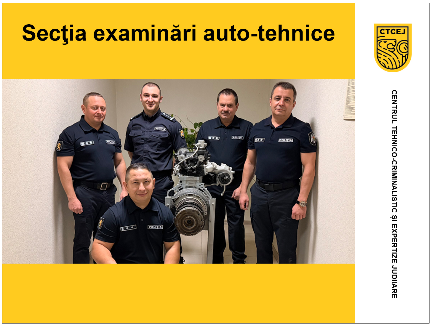 Astăzi vă prezentăm echipa Secției examinări auto-tehnice a Direcției examinări tehnice din cadrul CTCEJ. Aici, tehnologia, experiența și atenția la detalii se îmbină pentru a dezvălui adevărul ascuns în discordanța interacțiunii dintre automobil – drum - conducător - mediu. Experții analizează cu precizie circumstanțele accidentului rutier și automobilele implicate, determinând cauzele, defecțiunile care au generat impactul rutier. Expertiza lor, transformă urmele tehnice în dovezi incontestabile, contribuind la elucidarea circumstanțelor și la consolidarea încrederii în actul de justiție.
