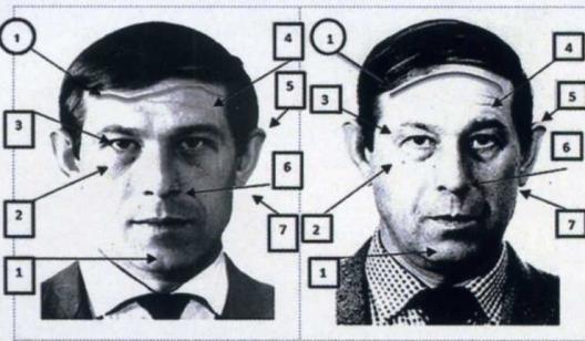 • identificarea persoanei amnezice sau care îşi ascunde identitatea, prin compararea caracteristicilor generale şi individuale ale persoanei din fotografia (imaginea video) în litigiu (în cauză) cu cea din fotografia model de comparaţie;